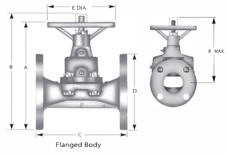 | Valve Size | A | B | C Maxi-Trol (MSS Length) Plastic Lined | C Maxi-Trol (MSS Length) Rubber Lined | C Maxi-Trol (MSS Length) Weight (lbs) | C Tru-Trol (ANSI Length) | Weight (lbs) | D | E | Body Pressure Rating (PSI) |